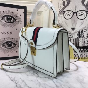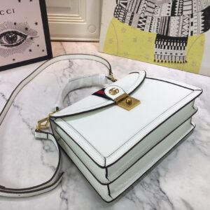 The Gucci Ophidia small top handle bag with Web Black/White is a stylish and environmentally conscious accessory. Made from black and white leather with shiny gold-toned hardware. the bag features the iconic green and red House Web stripe and Double G hardware. The microfiber lining has a suede-like finish and the inserts are made from leather that has been tanned using an alternative metal or chrome-free process. reducing the environmental footprint. The bag has a magnetic closure and includes an internal zip pocket and open pocket. It can fit a cell phone up to W78mm x H167mm x D9mm and has a handle with a 10cm drop and a detachable shoulder strap with a 48.5cm drop. The small size of the bag is W25cm x H17.5cm x D7cm and it weighs approximately .7kg. This top handle bag is part of the Epilogue collection and has a vintage-inspired square shape that is accentuated by the House Web stripe and Double G hardware. Crafted from the House’s monogram canvas. the style has a strong logo feel.
