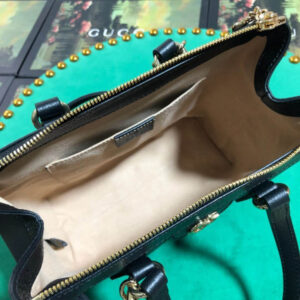 The world of Ophidia evolves with the introduction of the small top handle tote in black leather. Equipped with a detachable shoulder strap and inlaid green and red Web stripe. the accessory is enhanced by a petite play on the Double G. an archival Gucci code from the ’70s that appears atop a leather tab detail and on the zipper pull.