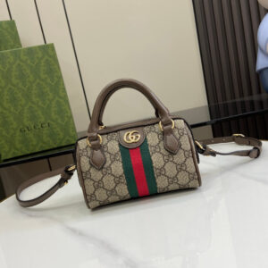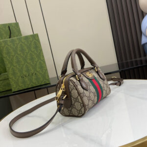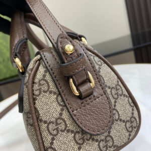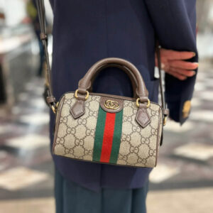 The Ophidia line is enriched by the introduction of the boston mini bag. Crafted from beige and ebony GG Supreme canvas, the accessory is enriched by the Double G hardware and a Web stripe. A detachable shoulder strap completes the design.