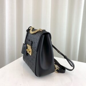 The structured backpack features defining details from the Padlock collection. The chain top handle is distinctive to the line. along with the key lock closure pulled straight from the archives. The key is placed in a detachable leather key case. Made in heat debossed Gucci Signature leather with a defined print and firm texture.