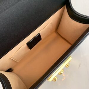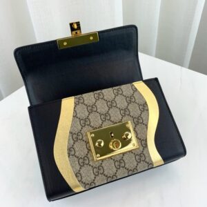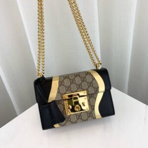 A small structured chain shoulder bag with a key lock closure pulled straight from the archives. the key is placed in a leather key case. The GG Supreme canvas is crafted from a coated microfiber fabric with the GG motif. The abstract design is made from a super soft. delicate leather with a soft shiny metallic leather edge.