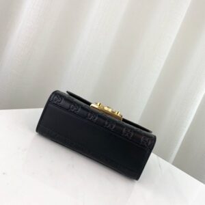 A small structured Gucci Signature leather bag with a key lock closure pulled from the archives. the key is placed in a leather key case that loops around the chain. The sliding chain strap can be worn multiple ways. changing between a shoulder and a top handle bag. Made in heat debossed Gucci Signature leather resulting in a defined print with a firm texture.