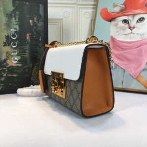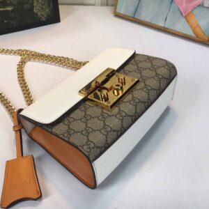 The Gucci Padlock small shoulder bag 409487 is a stylish and functional accessory that is perfect for any occasion. Made in Italy. this bag features a beige and ebony GG Supreme canvas material that is environmentally friendly. The white leather top and gold-toned hardware add a touch of elegance to the design.