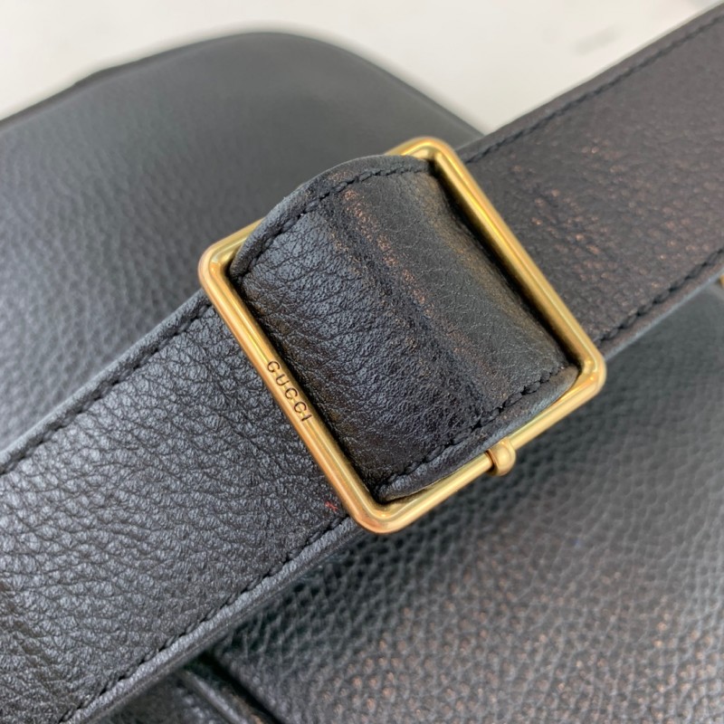 A down-sized version of the messenger bag introduced in Pre-Fall 2018. the leather shoulder bag is crafted from textured black leather printed with the Gucci logo. The distinctive trademark appears on the front of the bag??an eighties inspired motif that encompasses the House name with the Web and Interlocking G. An adjustable leather shoulder strap. front pocket and zipper closure complete the style.