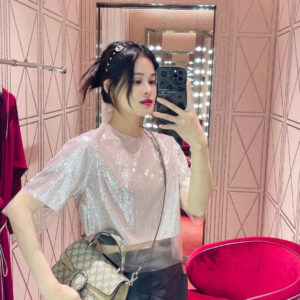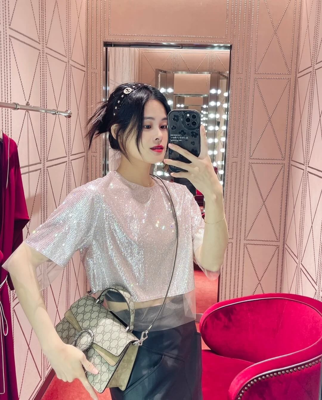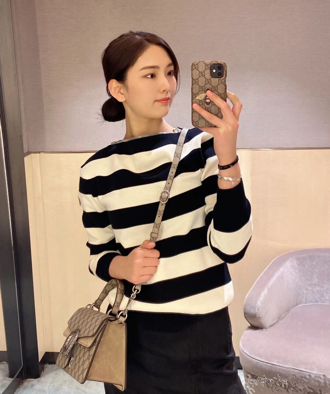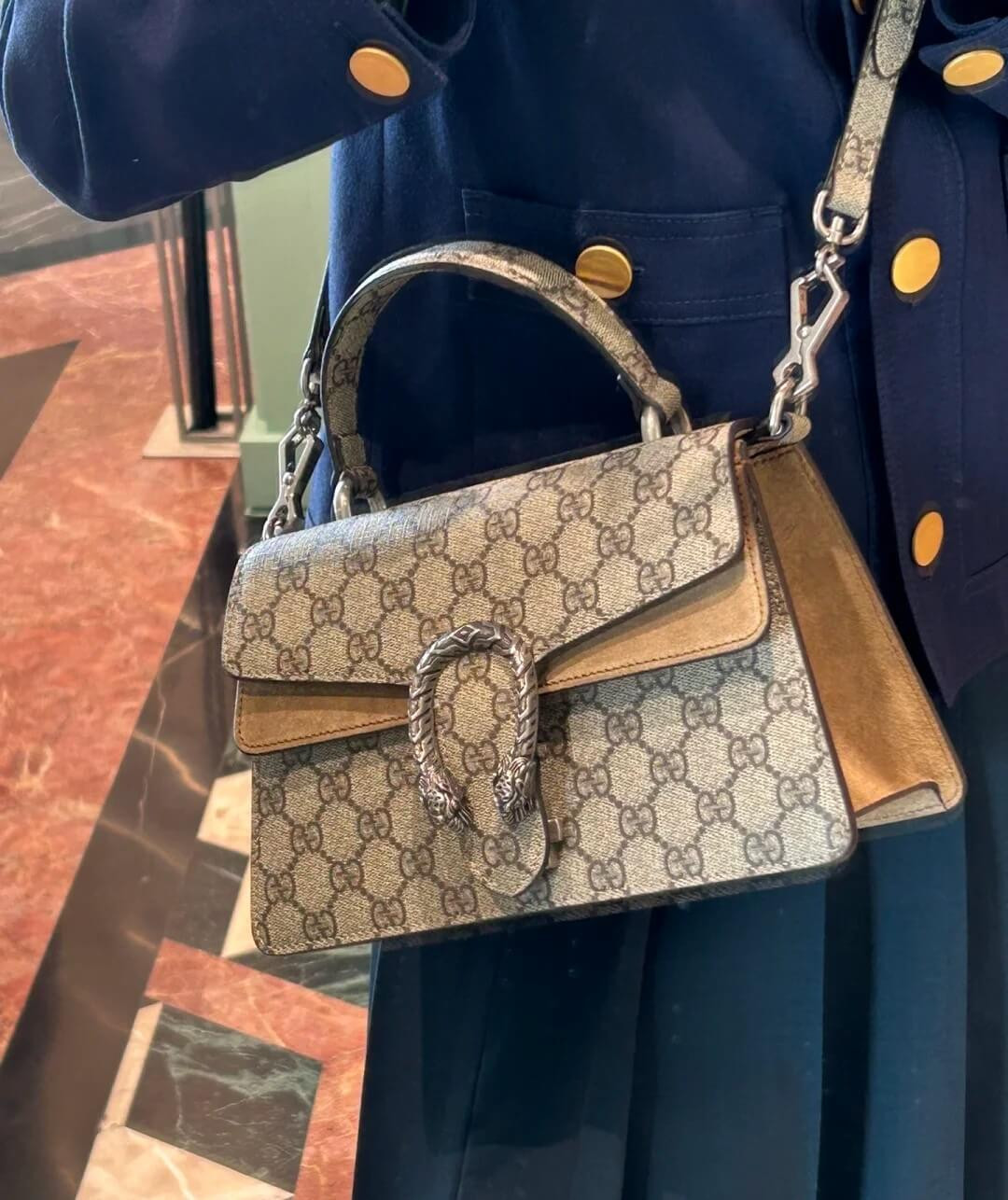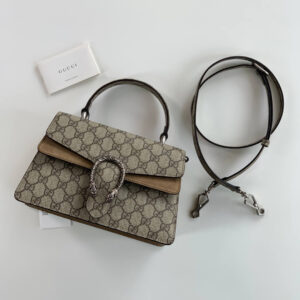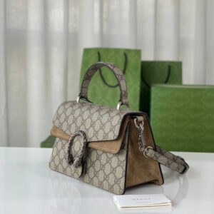 A structured GG Supreme canvas top handle bag appears beige and ebony with subtle taupe suede trim. The textured tiger head closure defines the front as a unique hardware detail.