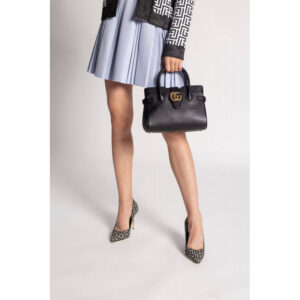 Taken from the ’70s archives. the Double G recalls one of the heydays of the House. The hardware first appeared as a monogram belt buckle but has evolved into one of the brand’s most emblematic codes. Here. the gold-toned detail defines a top handle bag in black leather. A detachable shoulder strap adds a versatile note to the style.