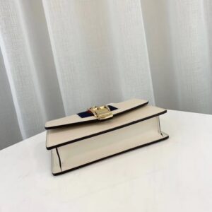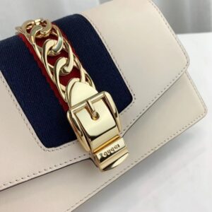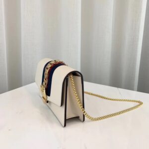 he Sylvie mini chain bag features the nylon Web embedded under the leather and decorated with a gold chain and buckle. The metal buckle closure was taken from the House’s archives. Made in our smooth. classic leather.