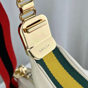 An ode to the timeless Hollywood glamour that shaped Gucci Love Parade, classic elements from the House’s archives are reintroduced. Distinguished by its crescent moon shape, the accessory is further defined by a G shaped hook closure. Paired with soft materials, the heritage hardware creates a refined design with vintage appeal. This small version is crafted in black leather with orange and black Web trim.