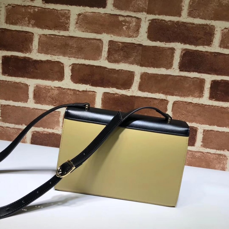 A new shape introduced to the Gucci Zumi line for Pre-Fall 2019. the small shoulder bag in bi-color black and beige leather is enriched with the collection’s distinctive Interlocking G Horsebit. Gucci continues to bring House icons to the forefront in unexpected ways. merging two of its codes into one symbol in a modern mix of silver and gold tones. First presented in Spring Summer 2019. Gucci Zumi takes its name from actress and experimental musician Zumi Rosow. who walked the runway carrying the bag. The shoulder bag has a flap with a special bar closure that open when both sides are pushed in together.