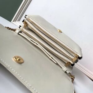 – Adjustable and removable chain and leather shoulder strap with 40 cm drop
