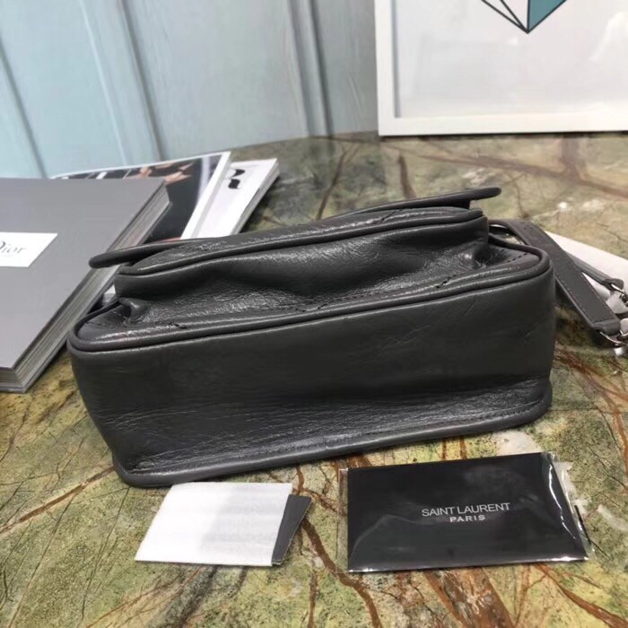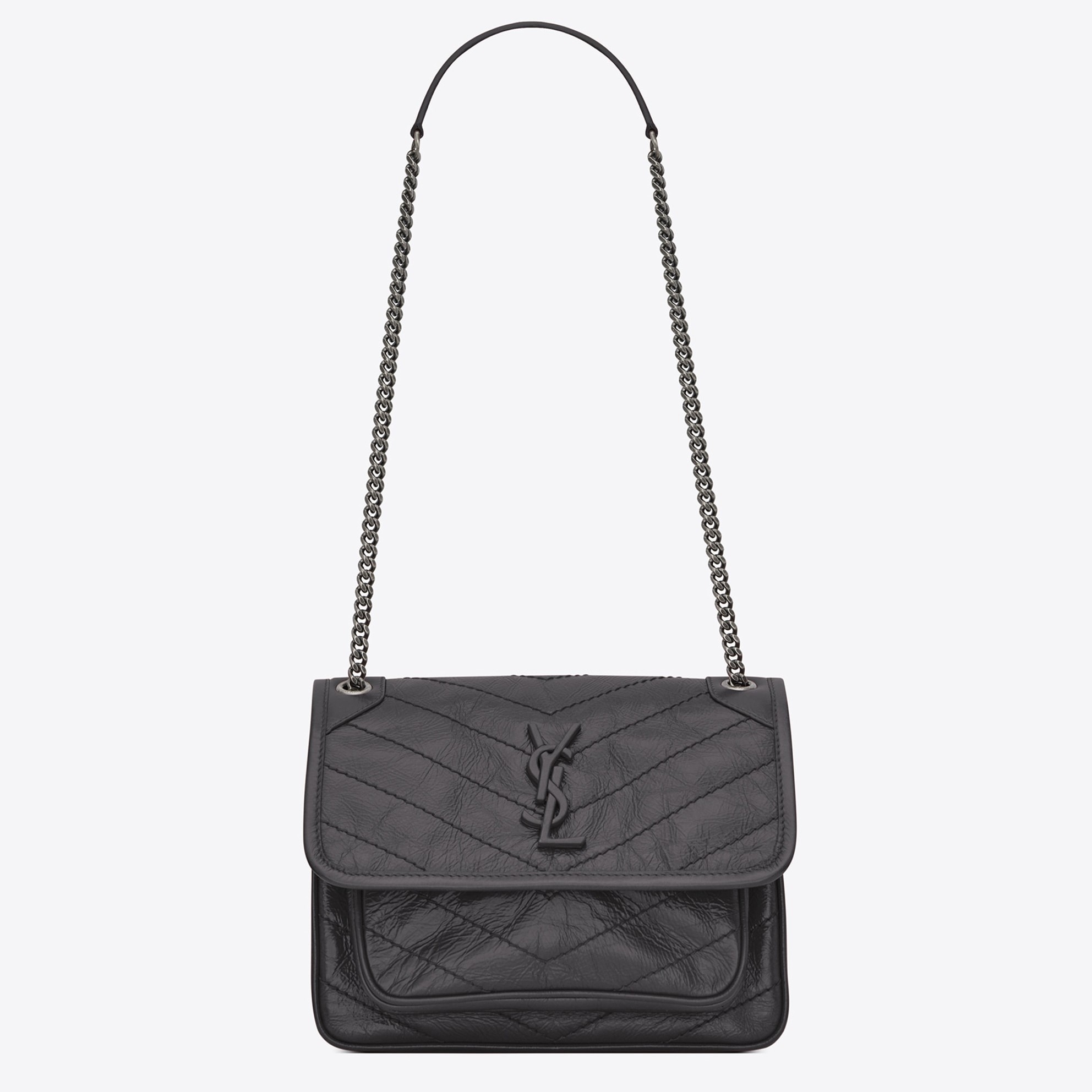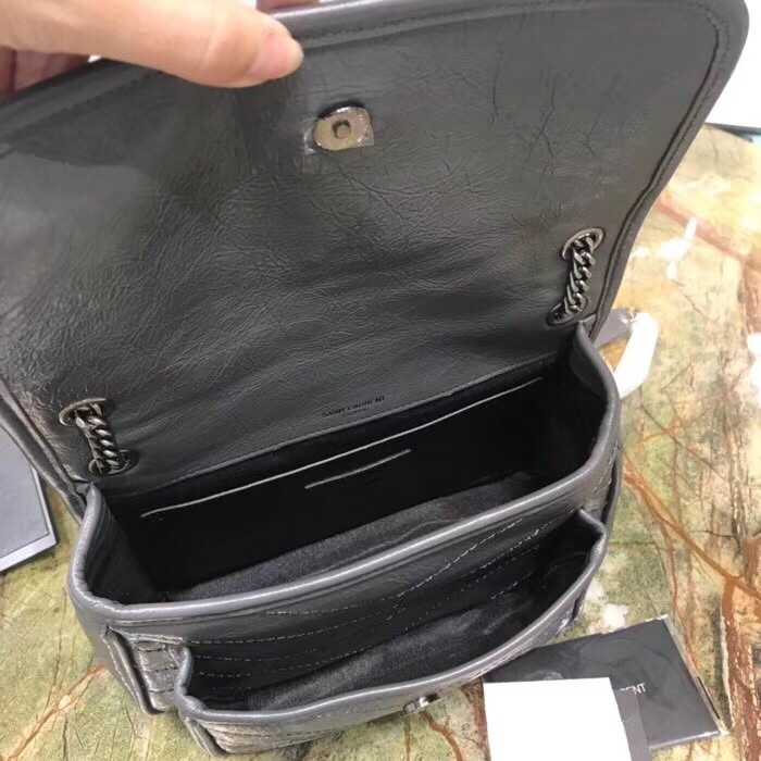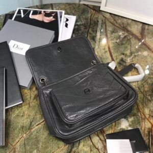 – One central compartment, one inside pocket, one zippered pocket, one open pocket in back, and one pocket under flap