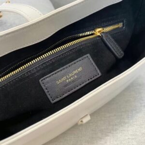 – Adjustable strap and tab closure with metal YSL hook