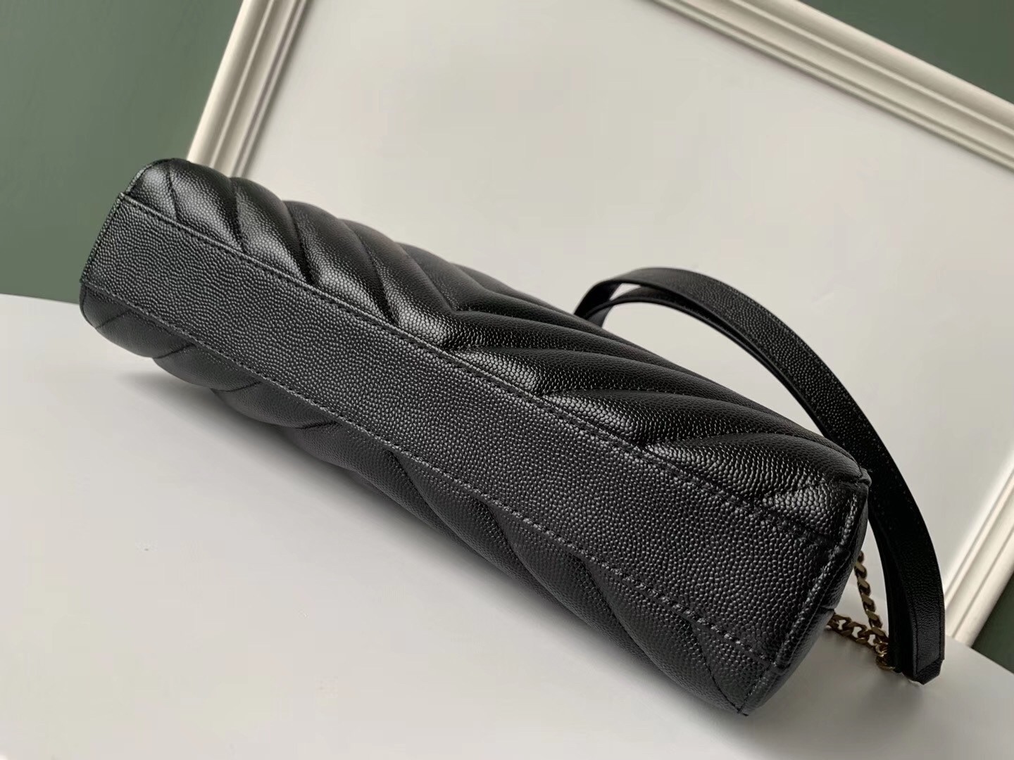 – Leather-reinforced chain handles with 29 cm drop