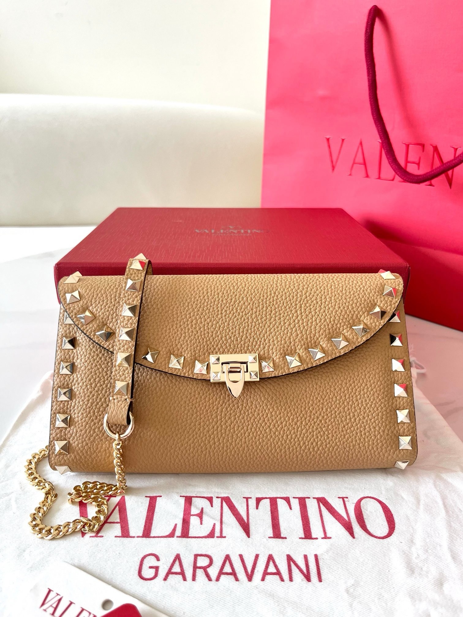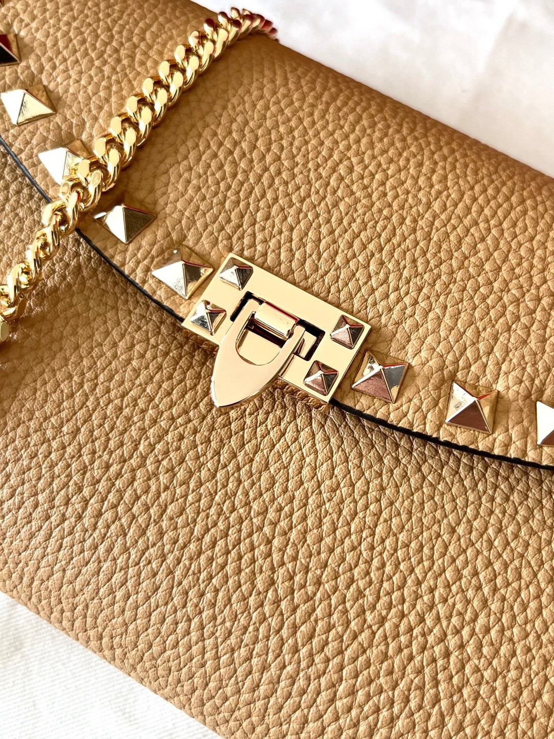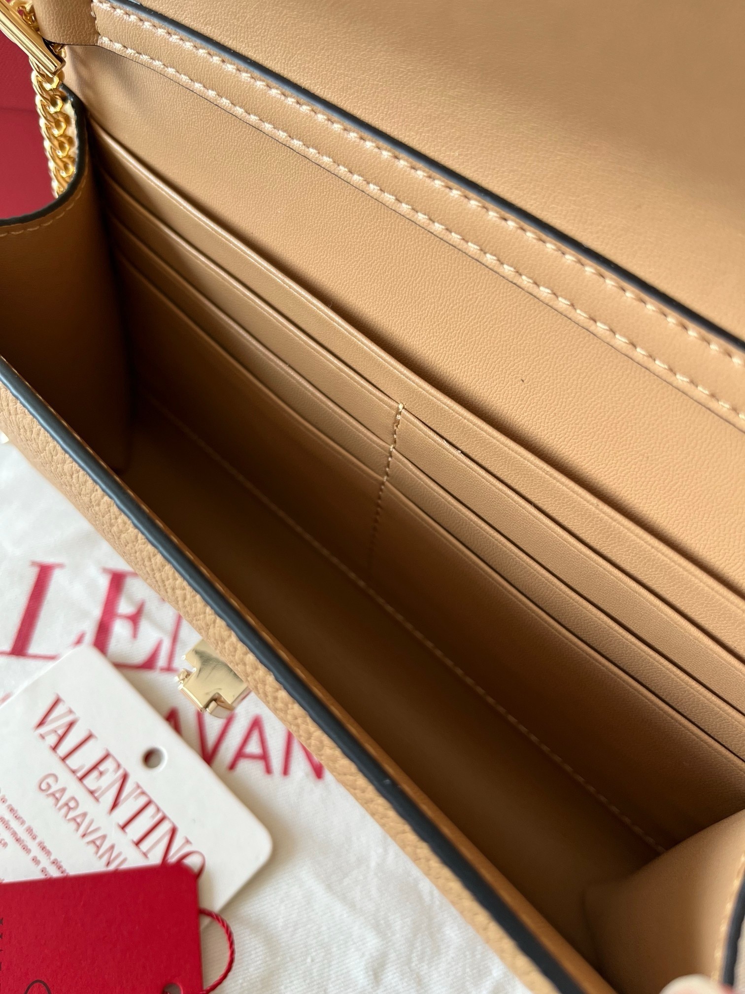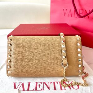 Valentino Rockstud Wallet with Chain in Beige Grained Leather