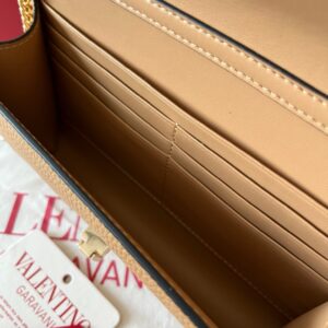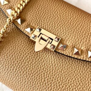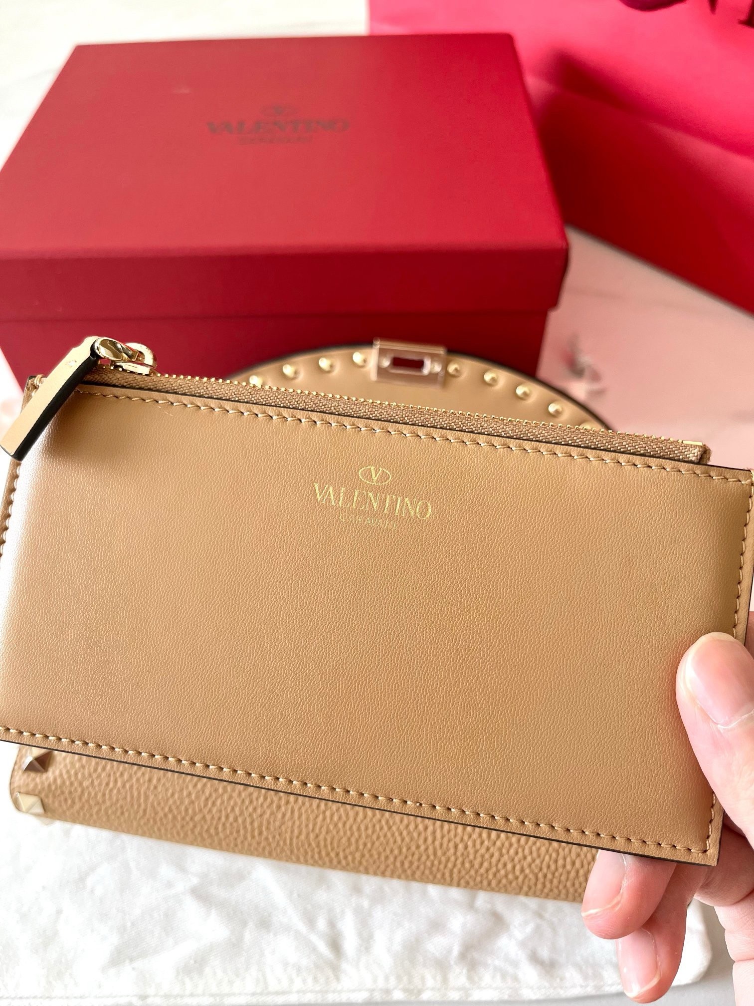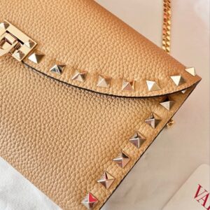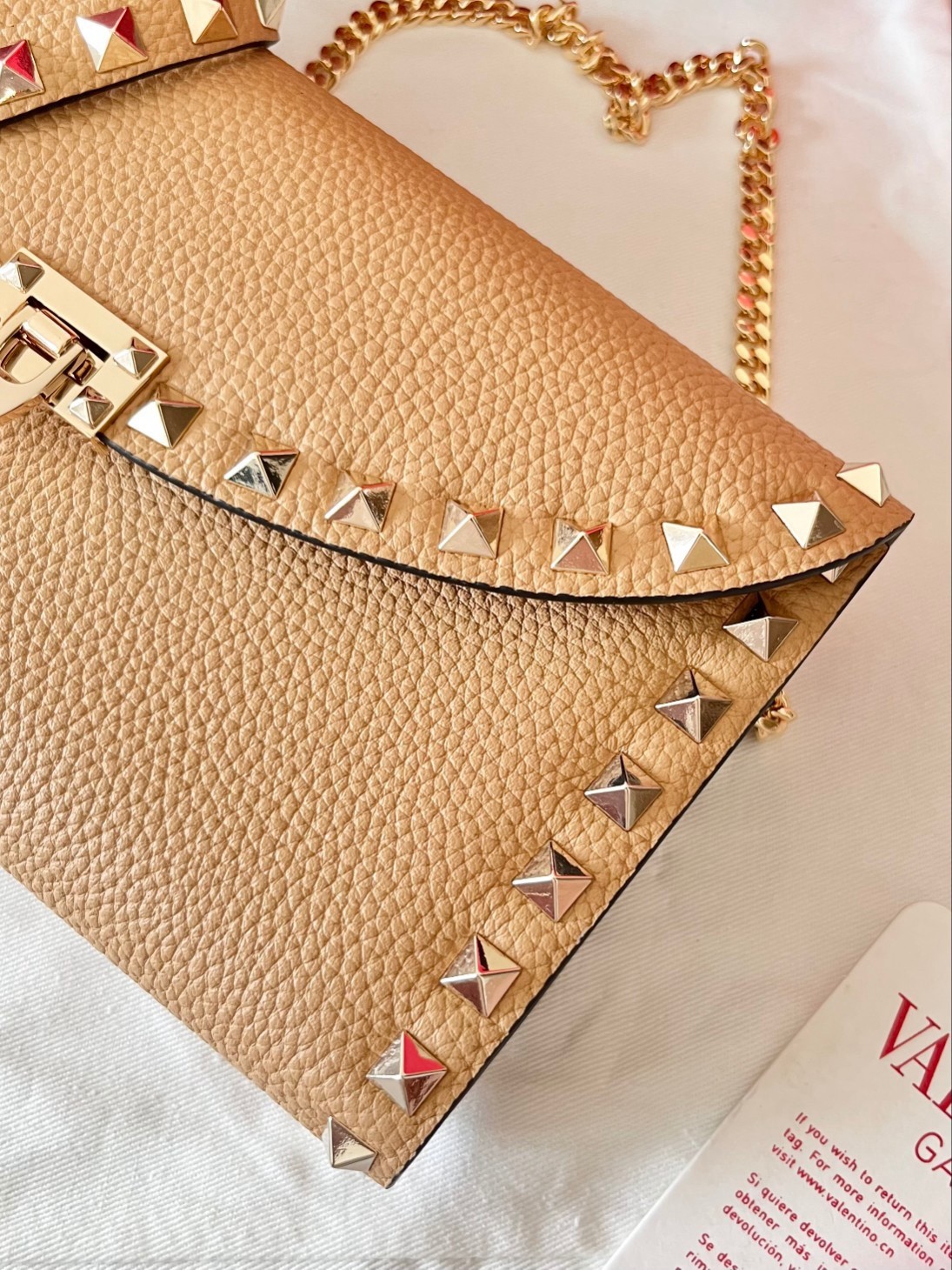 Valentino Rockstud Wallet with Chain in Beige Grained Leather