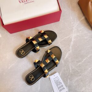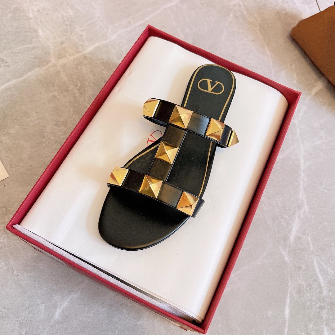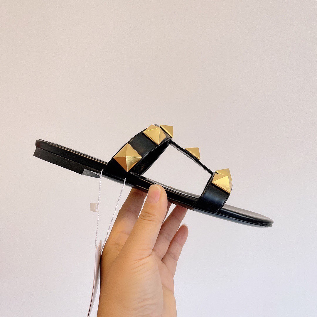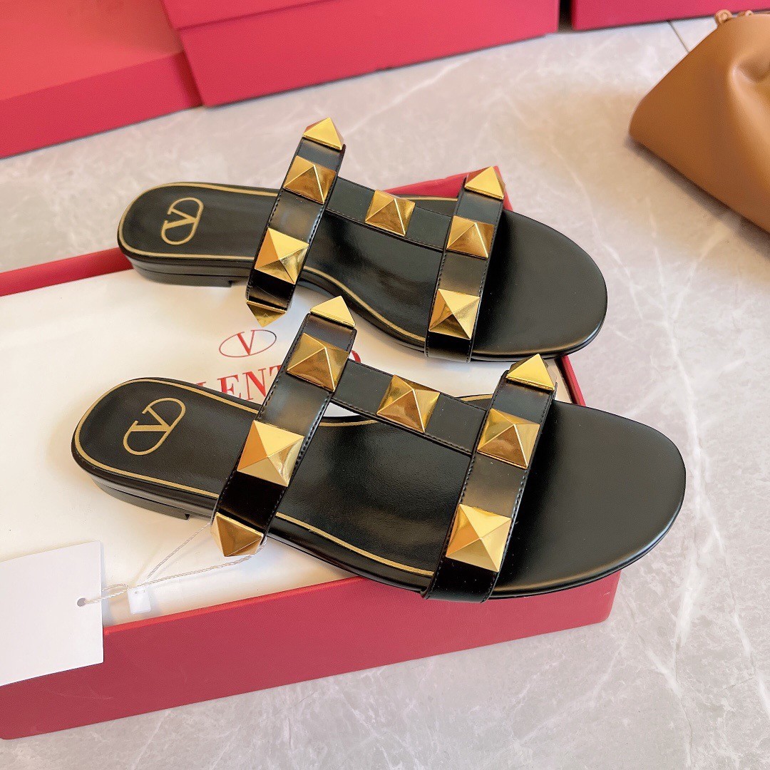 Valentino Roman Stud Flat Slides In Black Calfskin